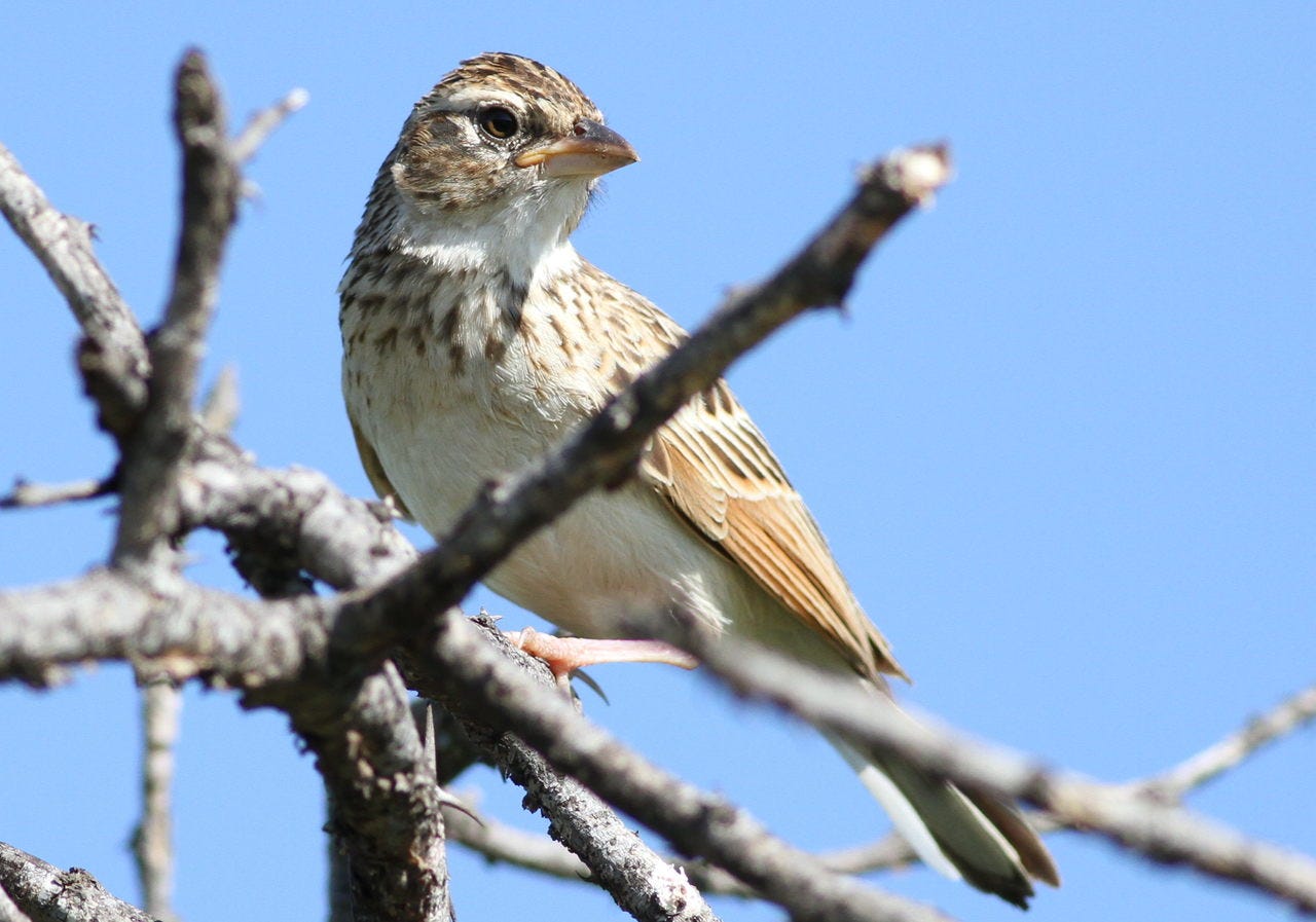 Off in the distance, dark clouds piled up against the blue sky, sending down long charcoal-colored streaks of rain that bent and curved and finally seemed to kick up bright scatterings of dust on the ground. It was mating season, and all the animals were putting on a show. A species called the monotonous lark was in peak breeding form and the male repeated its listless three-note song well into the night: “I am dull but persistent. Have sex with me.” (Hear the thrill for yourself on eBird.) The Benguela long-billed lark was much splashier, shooting straight up in the air, then whistling