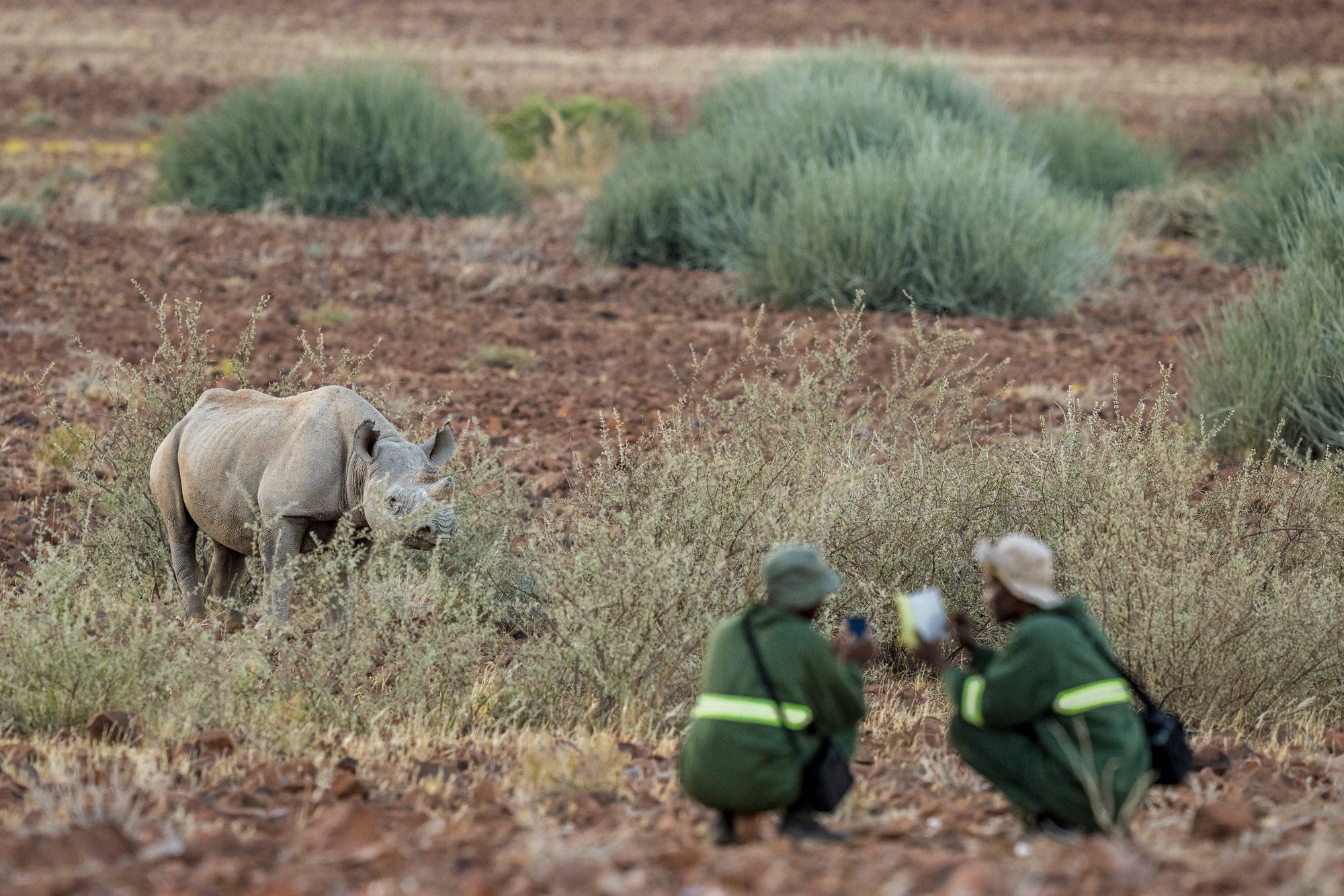 Next day was a little woollier. At eight a.m., the trackers spotted a rhino going behind a bend and we got out to follow on foot. The rains had made the desert go crazy, with knee-high grass growing everywhere. It was hilly country, and the ground was littered with ankle-turning red rocks. The trackers hoofed it, anyway, and Muntifering and I managed to tag along just behind. It was like running through knee-deep confetti across a floor covered in billiard balls. Bakkes was guiding a family with young kids, and they fell back, as the dad struggled under a telephoto lens like a bazooka.