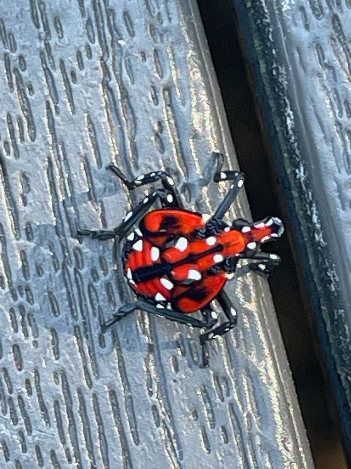 Mistake #2: I’ve had sumac plants springing up all over the place, and thought nothing of it. Staghorn sumac is a native species beneficial to bees, wasps, beetles, birds, and even some small mammals. I should have looked more closely: What I have isn’t sumac at all, but tree of heaven, another invasive that is the favorite host plant of these notorious insects, which turned up recently on our deck: