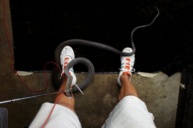 After Laita had been taking photos of the mamba for a while, he said, the snake calmly started to circle around his foot and he asked the collector to take his studio camera and hand him a point-and-shoot. He began rattling off photographs. Then, according to Laita, the collector reached in with the snake hook to draw the mamba away. Instead, the hook bumped into a red cable which was hanging down, and that spooked the snake, which struck.
