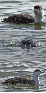 This winter, a red-throated loon showed up on calm days. In this species, the feet are placed so far back on the body that it can’t walk on land, except by shoveling itself along on its breast, wheel-barrow style. But underwater, where it hunts fish, it swam so fast that I had to guess where it was likely to surface, and then run to see if I could get there first. I think it knew what I was up to. It swam closer to the shore than necessary and seemed at times to be eyeing me sideways with mild Daffy Duck derision, just before it plunged manically back under. I eventually gave up on account of a dwindling sense of dignity.
